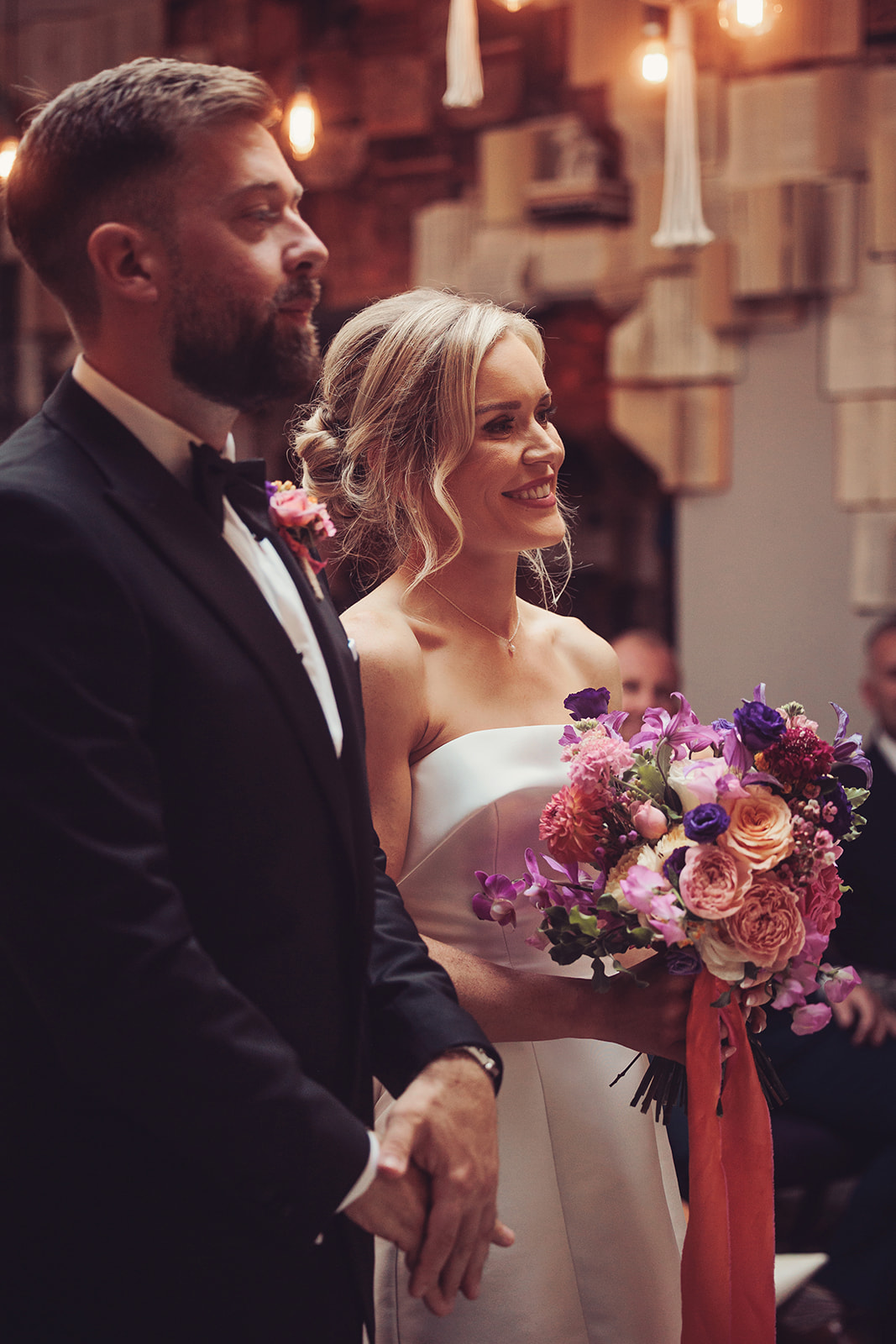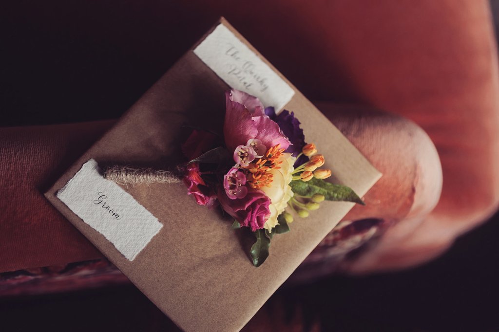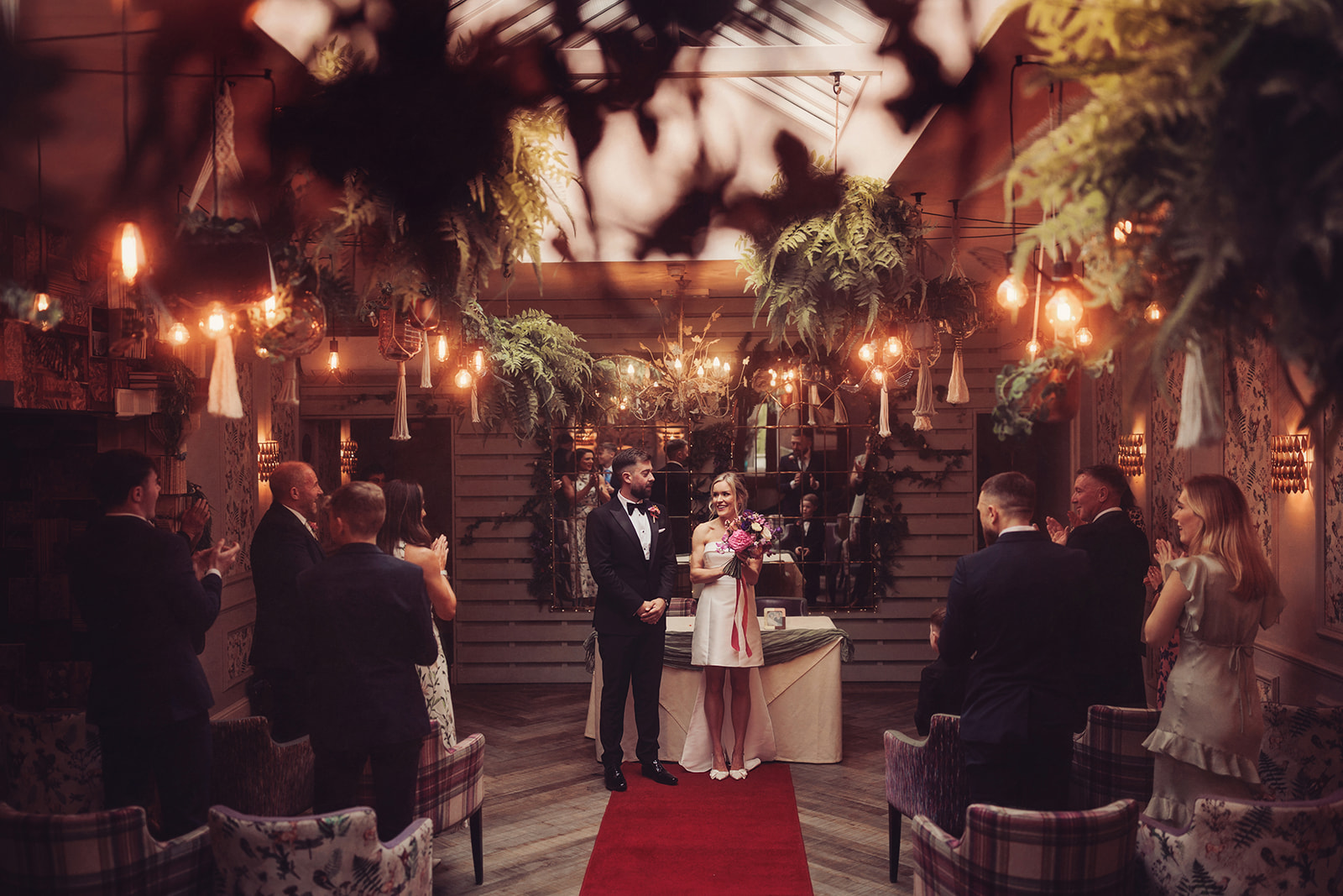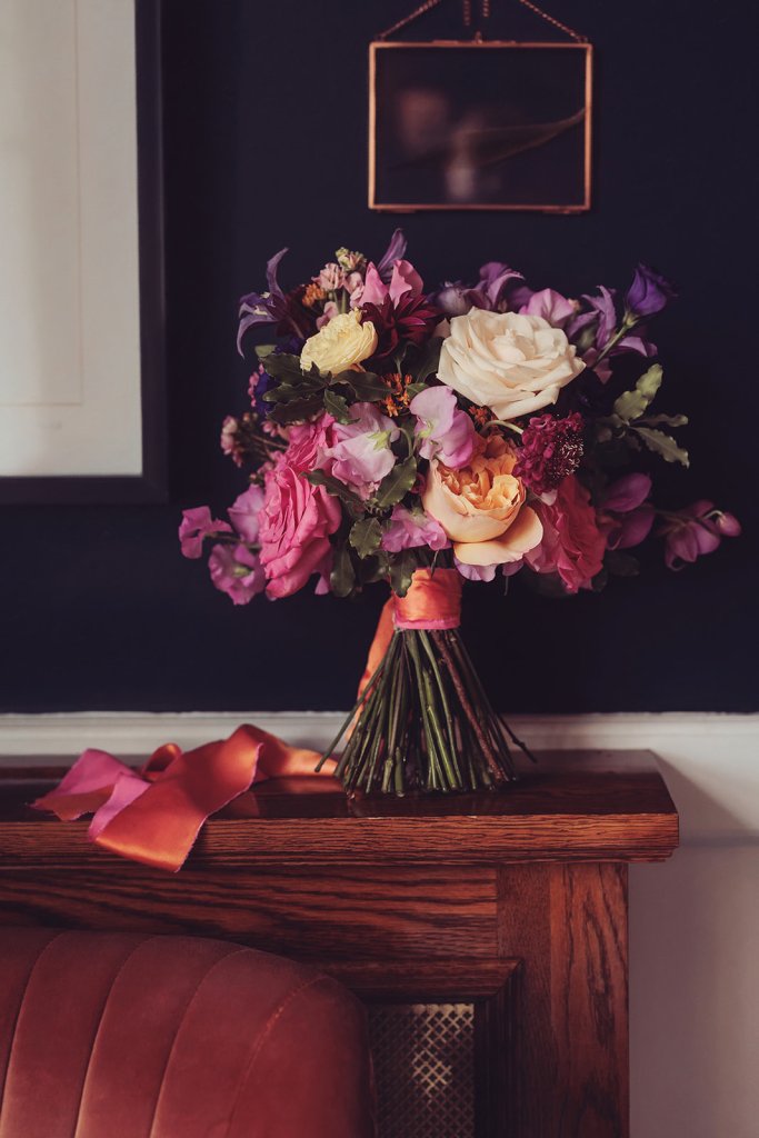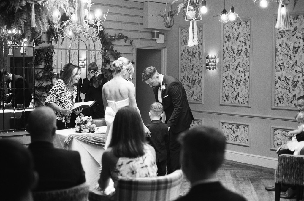The intimate wedding ceremony took place in the Hilltop room, a bright and airy room with colourful and eclectic decor.